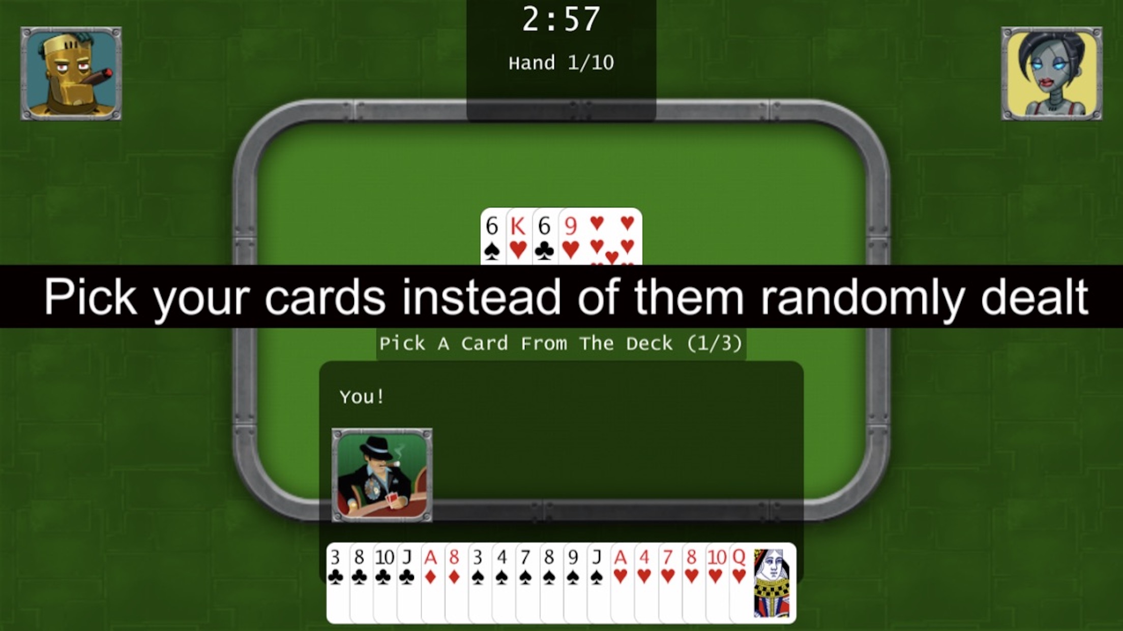 It's you against some of the smartest bots in the West. Everyone shares the same community cards and common deck. On each round everyone first privately picks a card from the same face-up limited deck that is randomly generated fresh from hand-to-hand to try to make the best poker-style hand. But watch out - if multiple players pick the same card, they are all dealt a THWART card that has no value!