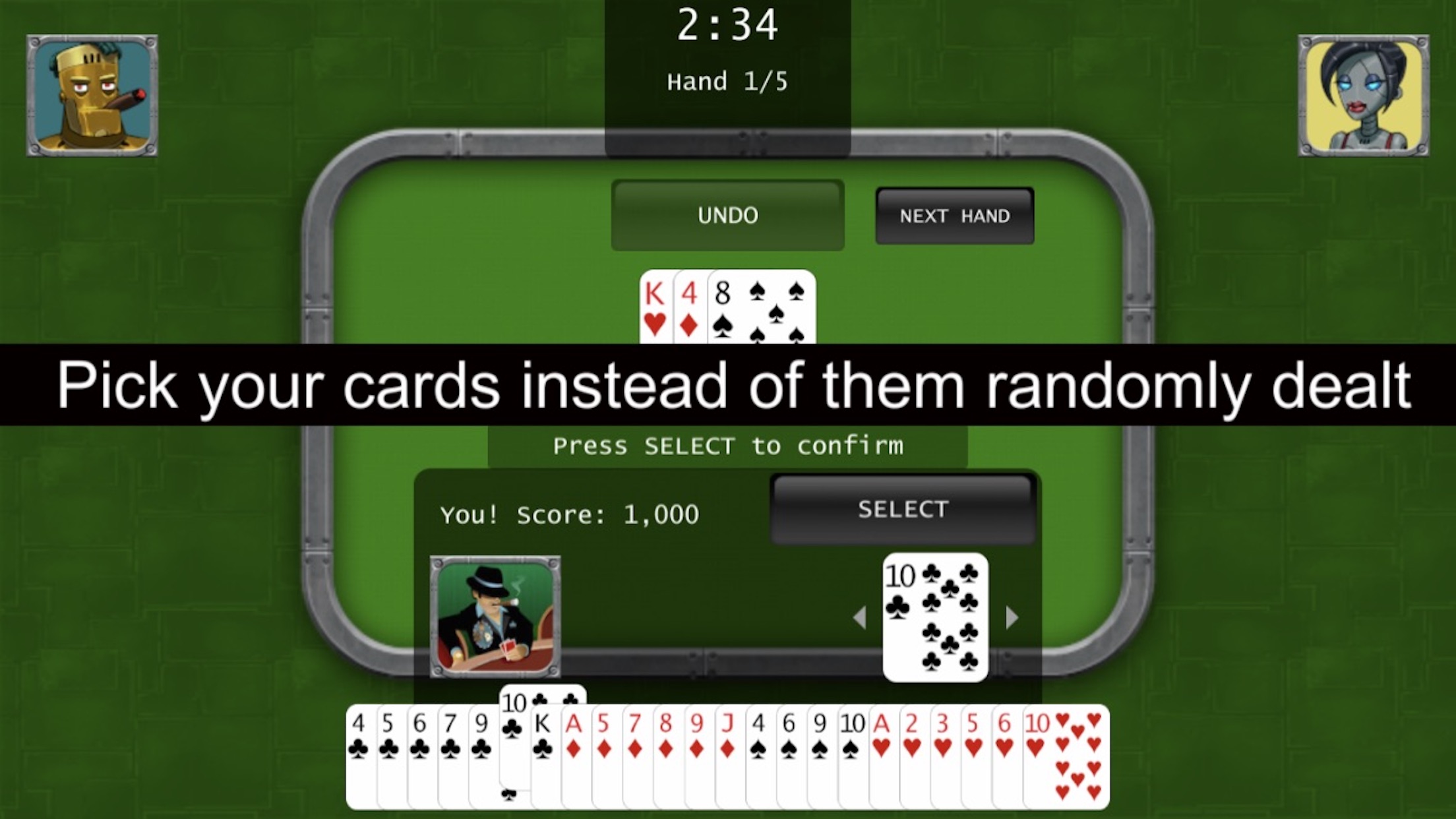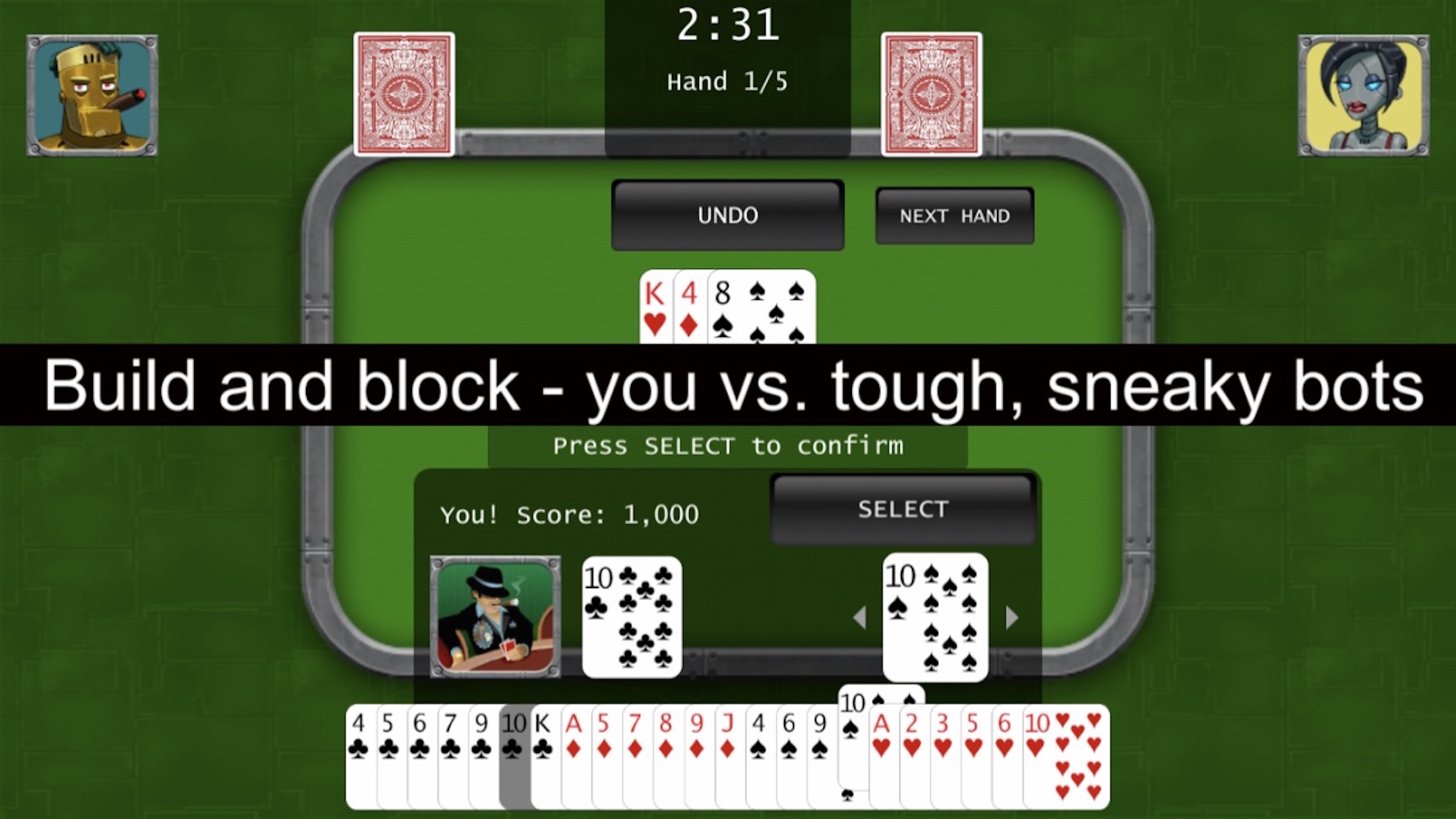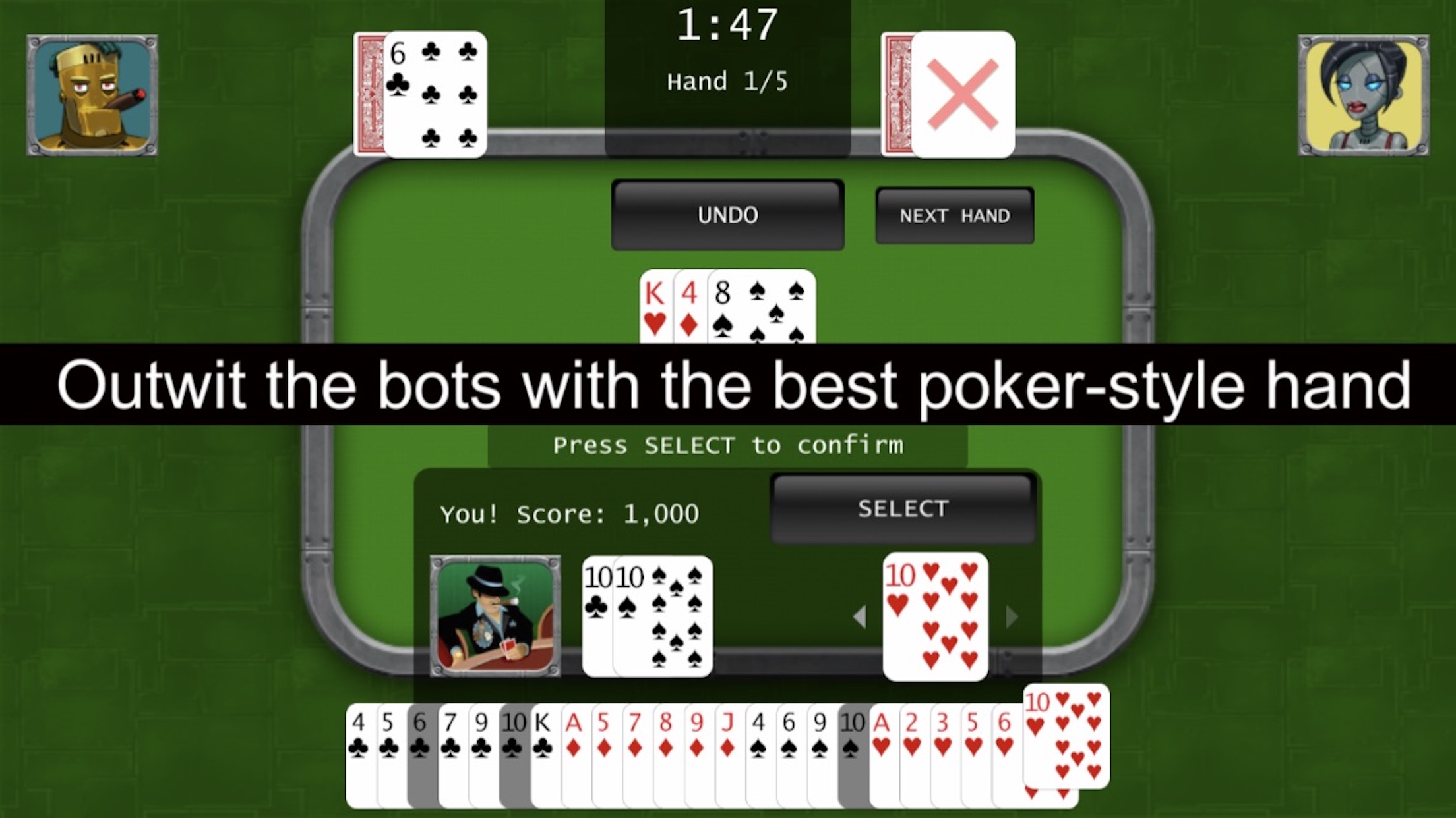 It's you against some of the smartest bots in the West. Everyone shares the same community cards and common deck. On each round everyone first privately picks a card from the same face-up limited deck that is randomly generated fresh from hand-to-hand to try to make the best poker-style hand. But watch out - if multiple players pick the same card, they are all dealt a THWART card that has no value!