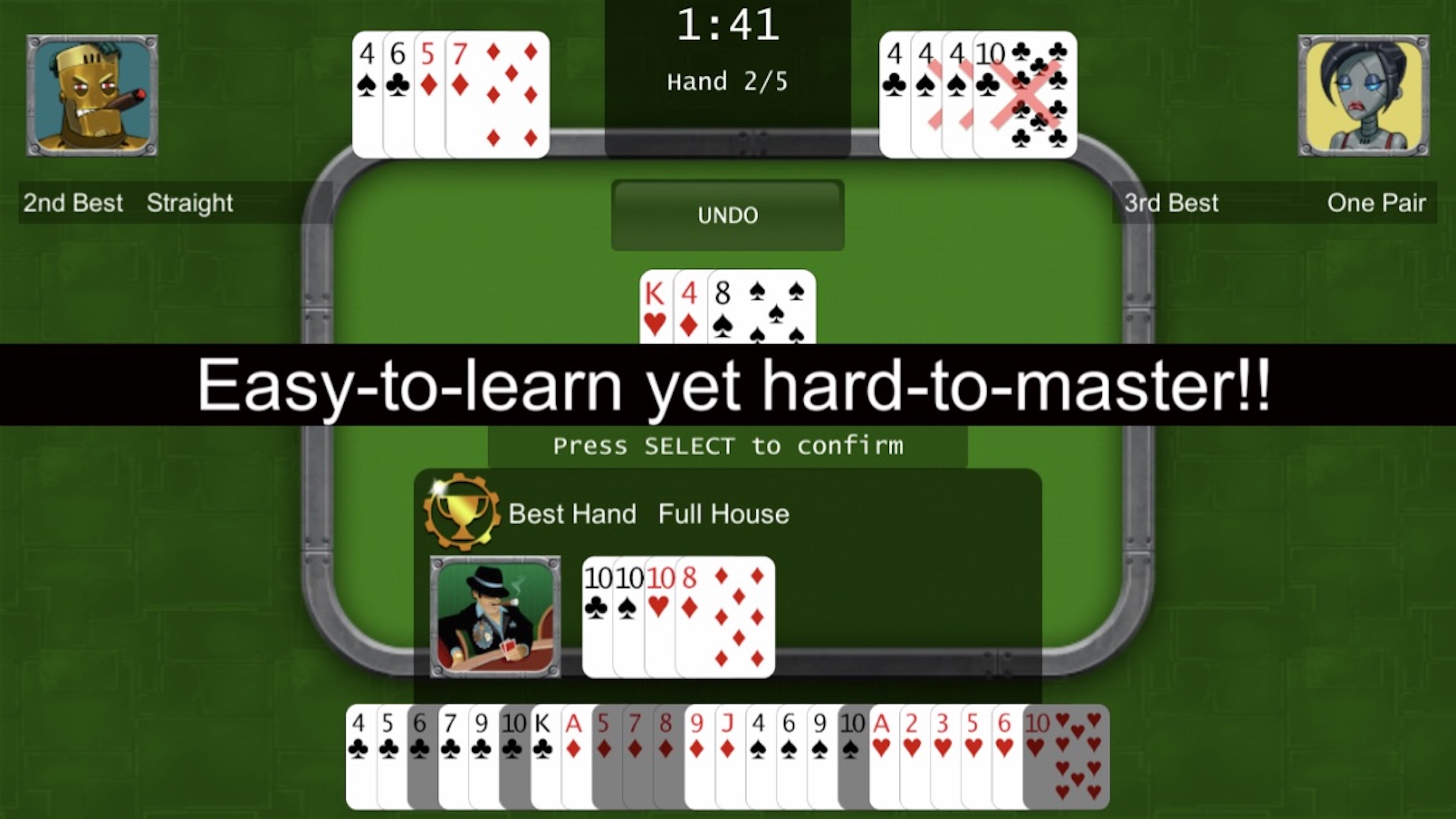 Pick'Em Puzzle® has an UNDO button that enables you to backup one or more rounds at anytime and then to move forward. The goal of each hand is to find a winning strategy using the fewest number of UNDOs. A tournament game consists of five hands played in 3 minutes or less. To proceed to the next hand, you must either win the current one or you can press the END HAND button and pay a penalty. Earn points for the quality of your hand if you win - and lose points for each UNDO or END HAND used. You also get points for time left on the clock.